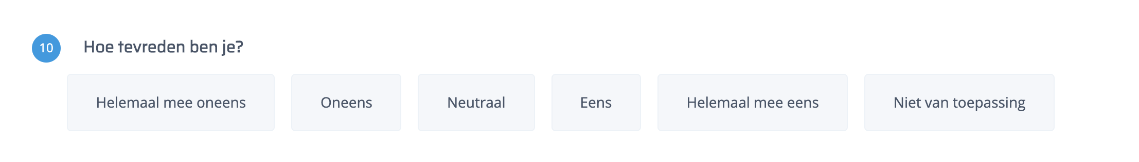 Met de Likertschaal vraag kun je de tevredenheid over een onderwerp uitvragen. Deze vraag kun je ook met de buttonvraag maken maar omdat deze vraagstelling veel voorkomt hebben we ook dit specifieke vraagtype ontwikkeld.
